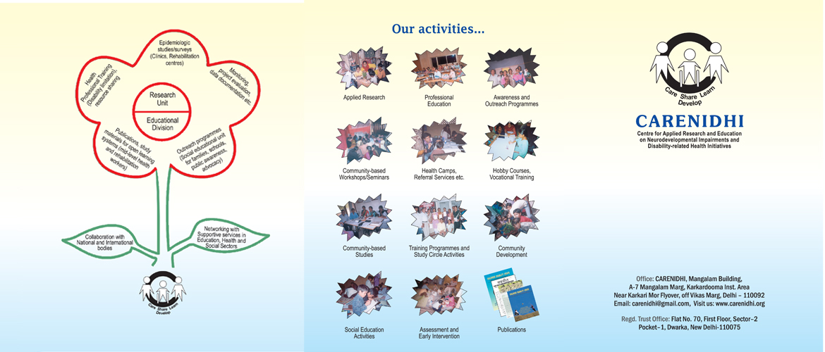 CARENIDHI (Centre for Applied Research and Education on Neurodevelopmental Impairments and Disability-related Health Initiatives) is a registered, non-profit organization (exempted u/s 80 G of the Income Tax Act, 1961) devoted to the promotion of education and applied research in the field of neurodevelopmental disabilities in children. The organization was initiated in 1997.
